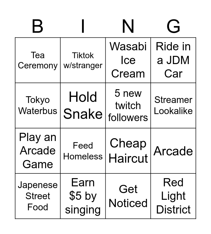 This bingo card has 16 words: Earn $5 by singing, Arcade, Wasabi Ice Cream, Tea Ceremony, Play an Arcade Game, Tiktok w/stranger, Cheap Haircut, Get Noticed, Tokyo Waterbus, Hold Snake, Japenese Street Food, Ride in a JDM Car, Feed Homeless, Streamer Lookalike, 5 new twitch followers and Red Light District.