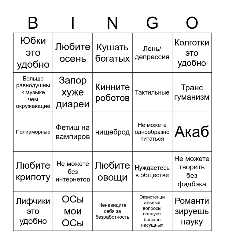 This bingo card has a free space and 24 words: Не можете без интернетов, ОСы мои ОСы, Кинните роботов, Лифчики это удобно, Колготки это удобно, Юбки это удобно, Больше равнодушны к музыке чем окружающие, Любите осень, Не можете однообразно питаться, Любите овощи, Тактильные, Полиаморные, Нуждаетесь в обществе, Не можете творить без фидбэка, Запор хуже диареи, Экзистенци альные вопросы волнуют больше насущных, Акаб, Кушать богатых, Транс гуманизм, Фетиш на вампиров, Романти зируешь науку, Любите крипоту, Лень/депрессия and Ненавидите себя за безработность.
