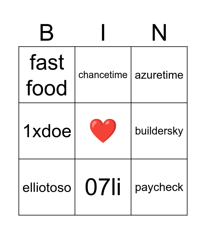 This bingo card has a free space and 11 words: chanceguest, 07li, paycheck, elliotoso, chancetime, azuretime, buildersky, double fedora, 1xdoe, fast food and the does.