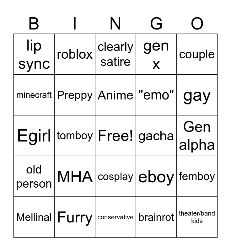 This bingo card has a free space and 24 words: MHA, Furry, Anime, Mellinal, couple, lip sync, minecraft, roblox, gacha, cosplay, "emo", Egirl, eboy, femboy, Preppy, brainrot, Gen alpha, clearly satire, gay, tomboy, theater/band kids, old person, gen x and conservative.
