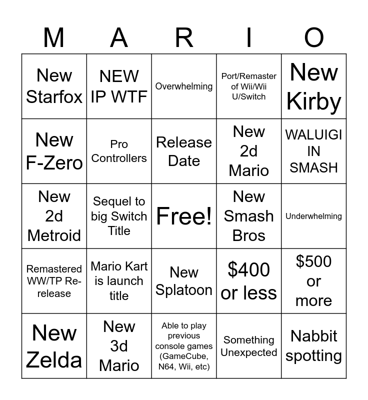 This bingo card has a free space and 24 words: Mario Kart is launch title, New 3d Mario, Release Date, New Zelda, New Kirby, New Starfox, New F-Zero, NEW IP WTF, New Smash Bros, New Splatoon, New 2d Mario, New 2d Metroid, $400 or less, $500 or more, Pro Controllers, Something Unexpected, Underwhelming, Overwhelming, WALUIGI IN SMASH, Sequel to big Switch Title, Nabbit spotting, Remastered WW/TP Re-release, Port/Remaster of Wii/Wii U/Switch and Able to play previous console games (GameCube, N64, Wii, etc).
