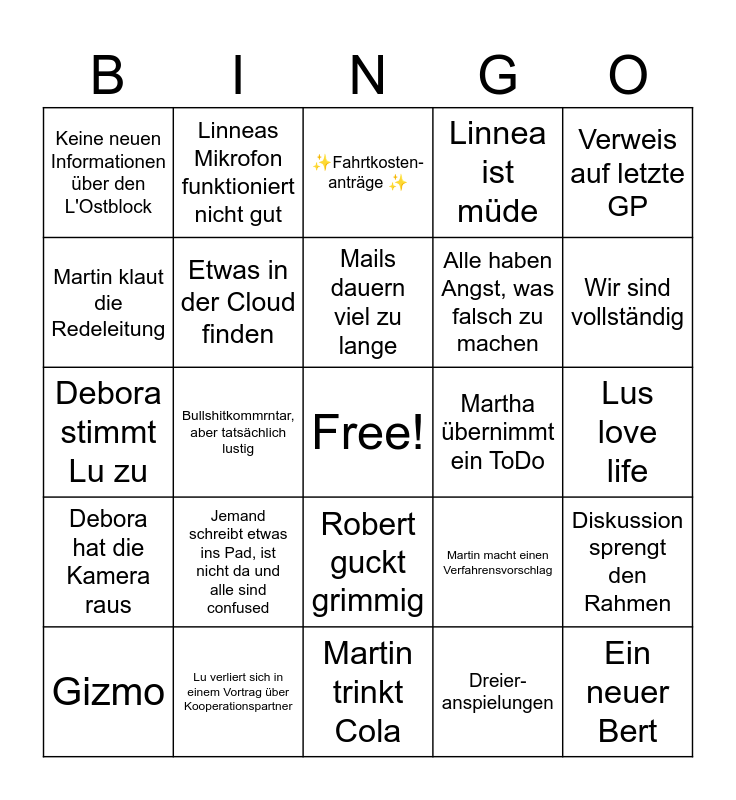 This bingo card has a free space and 29 words: Gizmo, Lucas ist müde, Bullshitkommrntar, aber tatsächlich lustig, ✨️Vorstand✨️, Keine neuen Informationen über den L'Ostblock, ✨️Fahrtkosten-anträge ✨️, Etwas in der Cloud finden, Jemand schreibt etwas ins Pad, ist nicht da und alle sind confused, Martha übernimmt ein ToDo, Lu verliert sich in einem Vortrag über Kooperationspartner, Lus love life, Ein neuer Bert, Martin trinkt Cola, Dreier-anspielungen, Wir sind vollständig, Redeleitung weiß nicht mehr wer dran ist, Robert guckt grimmig, Debora hat die Kamera raus, Verweis auf letzte GP, Debora stimmt Lu zu, Martin macht einen Verfahrensvorschlag, Clara wird gefragt "wie war das denn in Bonn", Alle haben Angst, was falsch zu machen, Martin klaut die Redeleitung, Linnea ist müde, Linneas Mikrofon funktioniert nicht gut, Diskussion sprengt den Rahmen, Mails dauern viel zu lange and Mails greifen TOPs vor.