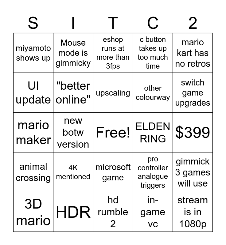 This bingo card has a free space and 24 words: 4K mentioned, HDR, upscaling, 3D mario, mario kart has no retros, miyamoto shows up, UI update, Mouse mode is gimmicky, ELDEN RING, microsoft game, other colourway, mario maker, pro controller analogue triggers, gimmick 3 games will use, "better online", in-game vc, $399, eshop runs at more than 3fps, switch game upgrades, new botw version, stream is in 1080p, animal crossing, c button takes up too much time and hd rumble 2.