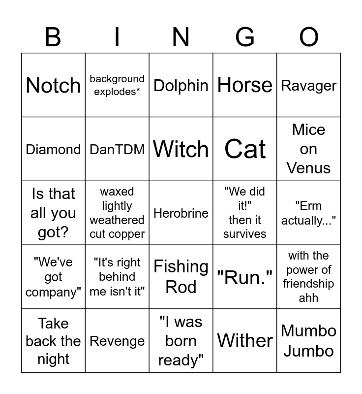 This bingo card has a free space and 24 words: "It's right behind me isn't it", Revenge, Witch, Take back the night, Ravager, Notch, Diamond, background explodes*, "We did it!" then it survives, Fishing Rod, Cat, Is that all you got?, "Run.", with the power of friendship ahh, DanTDM, Wither, "Erm actually...", Dolphin, Mice on Venus, waxed lightly weathered cut copper, Mumbo Jumbo, "We've got company", Horse and "I was born ready".
