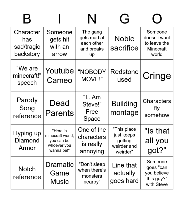 This bingo card has a free space and 61 words: Minecart Ride, Dramatic Game Music, Wither Mentioned, Hyping up Diamond Armor, Line that actually goes hard, Someone tries and fails at crafting, Youtube Cameo, Characters go to The End, Redstone used, "Don't Mine at Night", Noble sacrifice, Bad CGI/ Green Screen, "We are minecraft!" speech, "Don't dig straight down", Joke that is actually funny, Character has sad/tragic backstory, Someone goes "can you believe this guy?" with Steve, Someone doesn't want to leave the Minecraft world, "We gotta go... NOW!", "NOBODY MOVE!", Building montage, The gang gets mad at each other and breaks up, Notch reference, "Is that all you got?", Alex Mentioned, Herobrine mentioned, "That's new!", bad/outdated meme, Cringe, Jennifer Coolage kisses the villager, "IMAGINATION", Jack Black singing, "Guys, you gotta see this!", Animal interrupts someone, Someone gets hit with an arrow, Someone gets mad at Steve, "It's the minecraft prophecy!", Dead Parents, Movie ends with minecraft coming to the real world, Parody Song reference, Dirt House, "Here in minecraft world, you can be whoever you wanna be!", Characters fly somehow, "This is amazing!", "This place just keeps getting weirder and weirder", Characters enter a cave, Characters mine for diamonds, Random Dancing, The Power of Friendship, One of the characters is really annoying, "Don't sleep when there's monsters nearby", Looking an Enderman straight in the eye, "It's gonna blow", Dog taming scene, Zombie flesh/Spider's eye eating joke, Bucket of Water, Pig and Carrot, Ender Pearls, Zombie Villager, "Look how cute he is!" and Mining joke/gag.