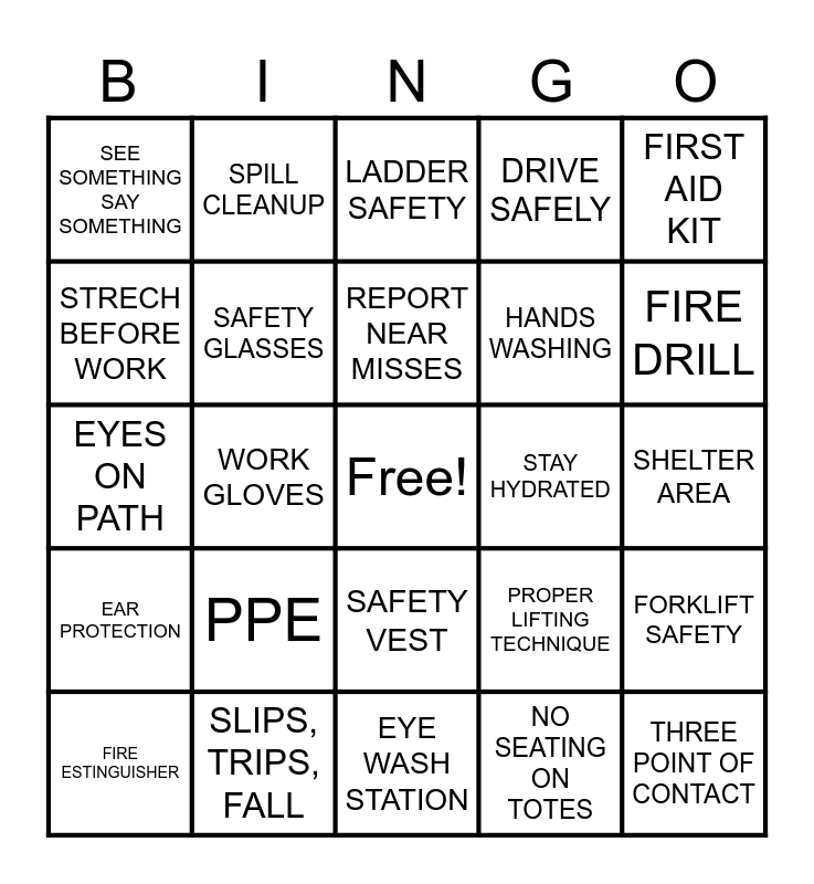 This bingo card has a free space and 24 words: PPE, SLIPS, TRIPS, FALL, REPORT NEAR MISSES, FIRE ESTINGUISHER, FIRST AID KIT, SEE SOMETHING SAY SOMETHING, STRECH BEFORE WORK, SPILL CLEANUP, STAY HYDRATED, SAFETY VEST, HANDS WASHING, EYES ON PATH, PROPER LIFTING TECHNIQUE, FORKLIFT SAFETY, SAFETY GLASSES, NO SEATING ON TOTES, SHELTER AREA, LADDER SAFETY, FIRE DRILL, WORK GLOVES, THREE POINT OF CONTACT, EAR PROTECTION, DRIVE SAFELY and EYE WASH STATION.