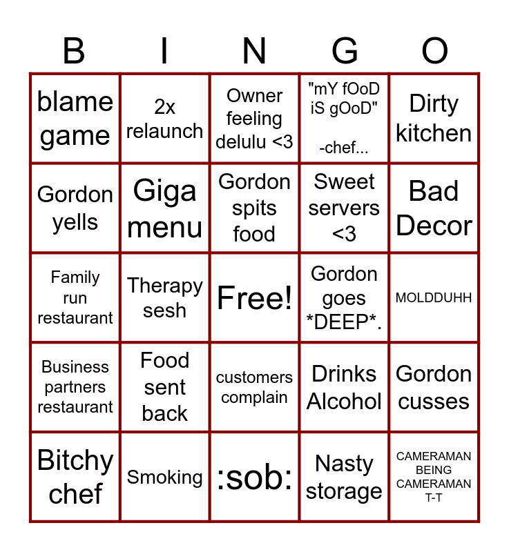 This bingo card has a free space and 24 words: Bitchy chef, Food sent back, Gordon spits food, Nasty storage, Dirty kitchen, blame game, 2x relaunch, Owner feeling delulu <3, Gordon goes *DEEP*., MOLDDUHH, Family run restaurant, Giga menu, Drinks Alcohol, Gordon cusses, Gordon yells, Smoking, :sob:, "mY fOoD iS gOoD" -chef..., Bad Decor, Business partners restaurant, Therapy sesh, customers complain, Sweet servers <3 and CAMERAMAN BEING CAMERAMAN T-T.
