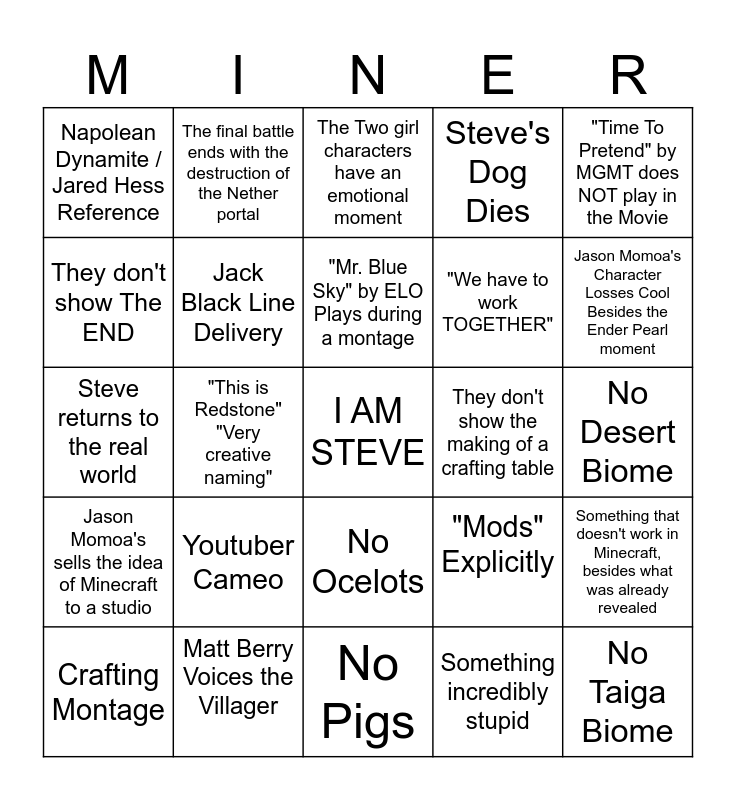This bingo card has a free space and 24 words: Youtuber Cameo, Matt Berry Voices the Villager, "Mr. Blue Sky" by ELO Plays during a montage, Crafting Montage, "Time To Pretend" by MGMT does NOT play in the Movie, Napolean Dynamite / Jared Hess Reference, They don't show The END, The final battle ends with the destruction of the Nether portal, They don't show the making of a crafting table, No Ocelots, "We have to work TOGETHER", Steve returns to the real world, "Mods" Explicitly, Something that doesn't work in Minecraft, besides what was already revealed, Jack Black Line Delivery, Something incredibly stupid, No Desert Biome, The Two girl characters have an emotional moment, Jason Momoa's Character Losses Cool Besides the Ender Pearl moment, "This is Redstone" "Very creative naming", No Taiga Biome, Jason Momoa's sells the idea of Minecraft to a studio, Steve's Dog Dies and No Pigs.