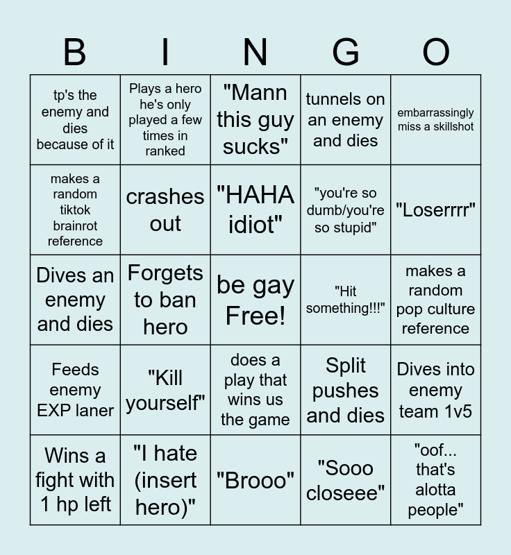This bingo card has a free space and 24 words: "Kill yourself", "I hate (insert hero)", "HAHA idiot", Wins a fight with 1 hp left, embarrassingly miss a skillshot, tp's the enemy and dies because of it, makes a random tiktok brainrot reference, Plays a hero he's only played a few times in ranked, "Hit something!!!", does a play that wins us the game, "you're so dumb/you're so stupid", Dives an enemy and dies, Split pushes and dies, Dives into enemy team 1v5, crashes out, "Sooo closeee", makes a random pop culture reference, "Mann this guy sucks", "Loserrrr", Forgets to ban hero, "oof... that's alotta people", Feeds enemy EXP laner, tunnels on an enemy and dies and "Brooo".