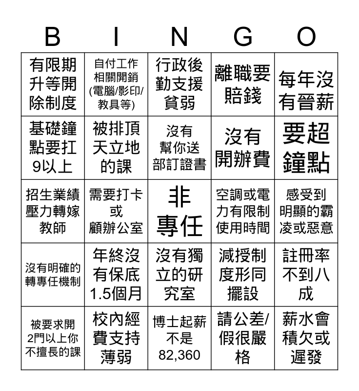 This bingo card has a free space and 24 words: 年終沒有保底1.5個月, 校內經費支持薄弱, 沒有 幫你送 部訂證書, 被要求開 2門以上你不擅長的課, 每年沒有晉薪, 有限期升等開除制度, 基礎鐘點要扛 9以上, 自付工作 相關開銷 (電腦/影印/教具等), 空調或電力有限制 使用時間, 沒有獨立的研究室, 沒有 開辦費, 招生業績壓力轉嫁教師, 減授制度形同擺設, 註冊率 不到八成, 被排頂天立地的課, 請公差/假很嚴格, 感受到 明顯的霸凌或惡意, 行政後勤支援貧弱, 要超鐘點, 需要打卡或 顧辦公室, 薪水會積欠或遲發, 沒有明確的 轉專任機制, 離職要賠錢 and 博士起薪 不是82,360.