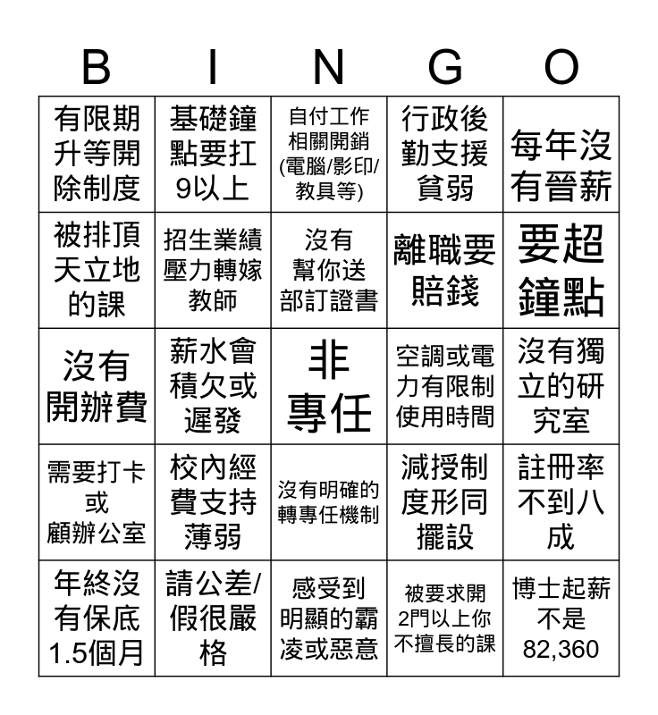 This bingo card has a free space and 24 words: 年終沒有保底1.5個月, 校內經費支持薄弱, 沒有 幫你送 部訂證書, 被要求開 2門以上你不擅長的課, 每年沒有晉薪, 有限期升等開除制度, 基礎鐘點要扛 9以上, 自付工作 相關開銷 (電腦/影印/教具等), 空調或電力有限制 使用時間, 沒有獨立的研究室, 沒有 開辦費, 招生業績壓力轉嫁教師, 減授制度形同擺設, 註冊率 不到八成, 被排頂天立地的課, 請公差/假很嚴格, 感受到 明顯的霸凌或惡意, 行政後勤支援貧弱, 要超鐘點, 需要打卡或 顧辦公室, 薪水會積欠或遲發, 沒有明確的 轉專任機制, 離職要賠錢 and 博士起薪 不是82,360.