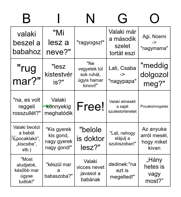 This bingo card has 2 images, a free space and 24 words: "Kis gyerek kis gond, nagy gyerek nagy gond!", "készül mar a babaszoba?", "Ne vegyetek túl sok ruhát, úgyis hamar kinovi!", "Most aludjatok, később mar úgyse tudtok!", Agi, Noemi -> "nagymama", valaki beszel a babahoz, "rug mar?", "Mi lesz a neve?", Valaki elmeséli a saját szulestortenetet, "belole is doktor lesz?", Lali, Csaba -> "nagypapa", "na, es volt reggeli rosszullét?", "Lali, nehogy elájulj a szuloszoban!", Az anyuka arról mesél, hogy miket kivan, "lesz kistestvér is?", dedinek:"na ezt is megelted!", Pocaksimogatás, "ragyogsz!", "meddig dolgozol meg?", Valaki könnyekig meghatódik, „Hány hetes is vagy most?”, Valaki becézi a babát („pocaklakó”, „kiscsibe”, stb.), Valaki már a második szelet tortát eszi and Valaki vicces nevet javasol a babának.