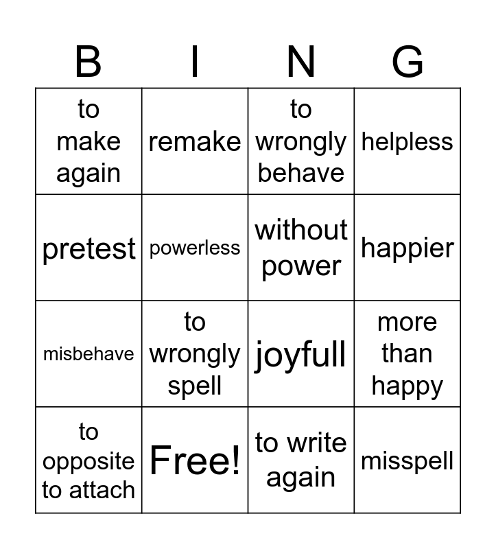 This bingo card has 31 words: full of joy, not equal, more than happy, someone who dances, to make again, to wrongly behave, without power, without help, Free!, to test before, to write again, to opposite to attach, someone who teaches, full of thanks, to wrongly spell, more than slow, teacher, thankful, misspell, slower, pretest, rewrite, detach, remake, misbehave, powerless, helpless, joyfull, unequal, happier and dancer.