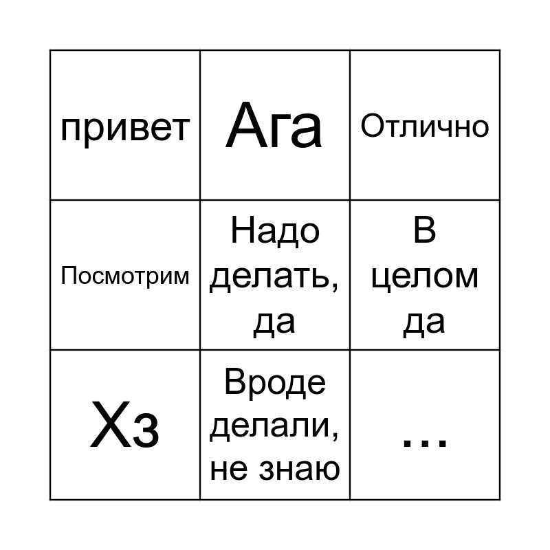 This bingo card has a free space and 8 words: В целом да, Отлично, Ага, Хз, привет, ..., Посмотрим and Вроде делали, не знаю.