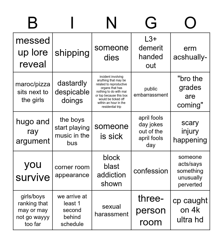 This bingo card has 25 words: corner room appearance, sexual harassment, incident involving anything that may be related to reproductive organs that has nothing to do with mai or top because this box would be ticked off within an hour in the residential trip, girls/boys ranking that may or may not go wayyy too far, erm acshually-, messed up lore reveal, maroc/pizza sits next to the girls, shipping, april fools day jokes out of the april fools day, block blast addiction shown, public embarrassment, hugo and ray argument, confession, someone acts/says something unusually perverted, dastardly despicable doings, cp caught on 4k ultra hd, scary injury happening, someone dies, "bro the grades are coming", the boys start playing music in the bus, someone is sick, we arrive at least 1 second behind schedule, you survive, L3+ demerit handed out and three-person room.