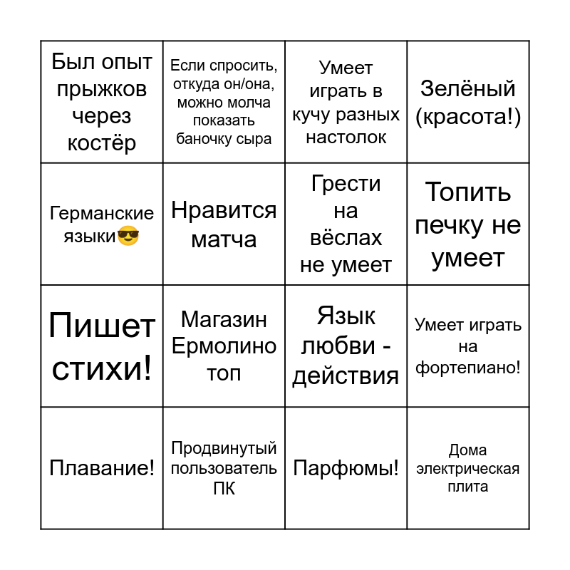 This bingo card has 16 words: Продвинутый пользователь ПК, Умеет играть на фортепиано!, Умеет играть в кучу разных настолок, Был опыт прыжков через костёр, Пишет стихи!, Если спросить, откуда он/она, можно молча показать баночку сыра, Язык любви - действия, Парфюмы!, Германские языки😎, Нравится матча, Плавание!, Зелёный (красота!), Магазин Ермолино топ, Топить печку не умеет, Грести на вёслах не умеет and Дома электрическая плита.