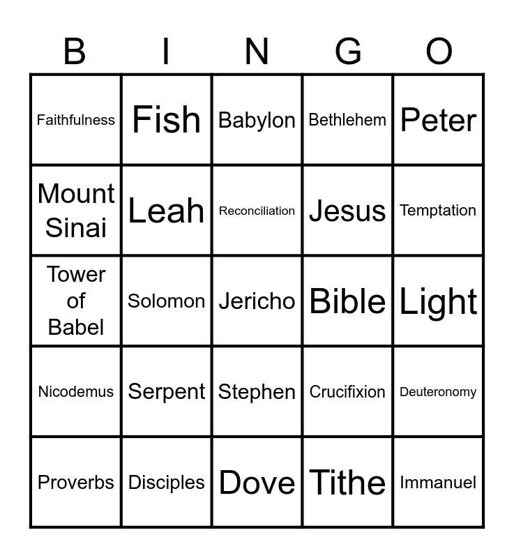 This bingo card has 150 words: The Flood, Passover, Apostle, Barnabas, Scripture, Amos, Malachi, Cross, Trinity, Sinai, Tabernacle, Creation, Jesus, Adam, Leah, Emmanuel, Glory, Obadiah, Scroll, Pentecost, Simeon, Heaven, Mercy, Patmos, Jerusalem, Jordan River, Immanuel, Bible, Net, Mount Carmel, Tithe, Psalms, Egypt, Nineveh, Anointing, Faith, Holy, Jonah, Jericho, Leviticus, Elisha, Messiah, Peter, Esther, Commandments, Sin, The Last Supper, Zacchaeus, Nicodemus, Hosea, Rapture, Stephen, Tower of Babel, Numbers, Christ, Truth, Baptism, Eve, Samuel, Ecclesiastes, Deliverance, Serpent, Mount Sinai, John, Thomas, Bethlehem, Fish, Ruth, Mark, Dove, Crucifixion, Psalter, Noah, Mary, Mantle, Hope, Manger, Garden of Eden, Reconciliation, Altar, Wisdom, Genesis, Samaria, Canaan, Light, Grace, Red Sea, Nazareth, Peace, Salvation, Covenant, Bethel, Ascension, Ten Plagues, Lamb, Miracle, Worship, Sacrifice, Revelation, Revival, Love, Coin, Joseph, Temptation, Sanctification, Song of Solomon, Bread, Matthew, Trumpet, Beatitudes, Paul, Angel, Joel, The Great Commission, Sabbath, Deborah, Church, Babylon, Ark, Testament, Messianic, Elijah, Intercession, Faithfulness, Disciples, Moses, Deuteronomy, Solomon, Judgment, Hagar, Gethsemane, Luke, Oil, Redemption, Exodus, Abraham, Prayer, Proverbs, Offering, Prophet, Stone, Saul, Daniel, Shepherd, Rainbow, Cain, Galilee, Acts, Mount Olives and Kingdom.