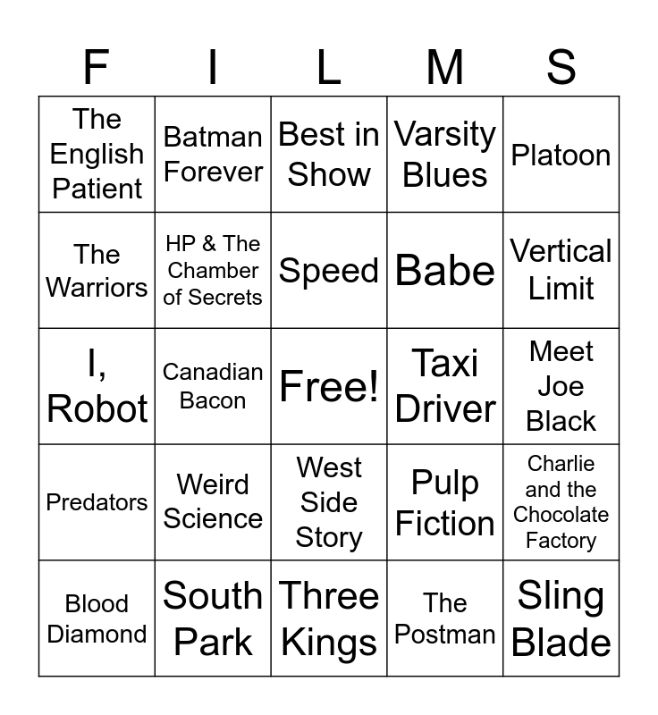 This bingo card has a free space and 64 words: The Hurt Locker, Monty Python, Goldeneye, Charlie and the Chocolate Factory, Cape Fear, Black Beauty, Batman Forever, Reality Bites, Speed, Behind Enemy Lines, West Side Story, Final Destination, Meet Joe Black, Platoon, Three Stooges, The Warriors, Canadian Bacon, The English Patient, The Girl with the Dragon Tattoo, Babe, Weird Science, Predators, Varsity Blues, On Golden Pond, The Three Musketeers, The First Wives Club, LA Confidential, The Nutty Professor, Swamp Thing, The Craft, You've Got Mail, The Fifth Element, Shutter Island, 12 Monkeys, Vertical Limit, Blood Diamond, Bowfinger, The Postman, Evolution, HP & The Chamber of Secrets, I, Robot, Taxi Driver, Edge of Tomorrow, Lord of the Flies, Godzilla, Sling Blade, South Park, Collateral, Pulp Fiction, Shallow Hal, Crouching Tiger, Hidden Dragon, Moonraker, Three Kings, Gandhi, Phone Booth, The Sum of all Fears, Best in Show, Nacho Libre, Repo Man, Braveheart, Starman, Zootopia, Mermaids and Speed Racer.