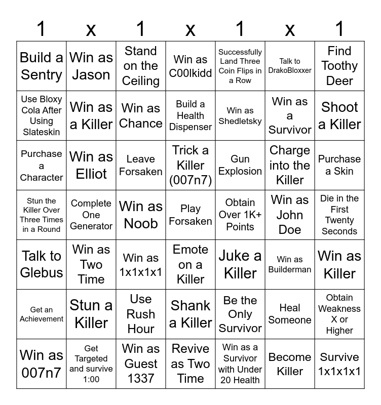 This bingo card has a free space and 48 words: Be the Only Survivor, Win as a Survivor, Revive as Two Time, Complete One Generator, Leave Forsaken, Die in the First Twenty Seconds, Win as Jason, Get Targeted and survive 1:00, Talk to DrakoBloxxer, Emote on a Killer, Find Toothy Deer, Win as C00lkidd, Charge into the Killer, Gun Explosion, Get an Achievement, Win as John Doe, Use Bloxy Cola After Using Slateskin, Shoot a Killer, Heal Someone, Successfully Land Three Coin Flips in a Row, Win as Shedletsky, Win as Noob, Build a Sentry, Win as a Killer, Obtain Weakness X or Higher, Win as Chance, Purchase a Skin, Win as 007n7, Trick a Killer (007n7), Win as Elliot, Become Killer, Obtain Over 1K+ Points, Win as Killer, Stun a Killer, Stun the Killer Over Three Times in a Round, Juke a Killer, Win as Builderman, Purchase a Character, Win as 1x1x1x1, Use Rush Hour, Talk to Glebus, Survive 1x1x1x1, Stand on the Ceiling, Win as Guest 1337, Build a Health Dispenser, Shank a Killer, Win as Two Time and Win as a Survivor with Under 20 Health.