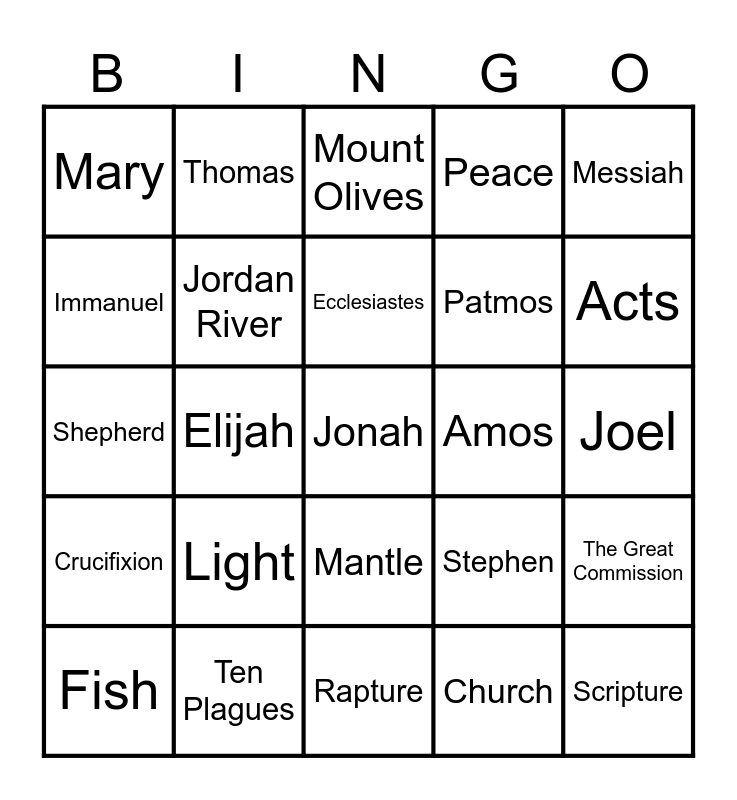 This bingo card has 151 words: Creation, Jesus, Adam, Leah, Emmanuel, Glory, Obadiah, Scroll, Pentecost, Simeon, Heaven, Mercy, Patmos, Jerusalem, Jordan River, Immanuel, Bible, Net, Mount Carmel, Tithe, Psalms, Egypt, The Flood, Passover, Apostle, Barnabas, Scripture, Amos, Malachi, Cross, Trinity, Sinai, Tabernacle, Egypt, Nineveh, Anointing, Faith, Holy, Jonah, Jericho, Leviticus, Elisha, Messiah, Peter, Esther, Commandments, Sin, The Last Supper, Crucifixion, Psalter, Noah, Mary, Mantle, Hope, Manger, Garden of Eden, Reconciliation, Altar, Wisdom, Genesis, Samaria, Canaan, Light, Grace, Red Sea, Nazareth, Peace, Zacchaeus, Nicodemus, Hosea, Rapture, Stephen, Tower of Babel, Numbers, Christ, Truth, Baptism, Eve, Samuel, Ecclesiastes, Deliverance, Serpent, Mount Sinai, John, Thomas, Bethlehem, Fish, Ruth, Mark, Dove, Salvation, Covenant, Bethel, Ascension, Ten Plagues, Lamb, Miracle, Worship, Sacrifice, Revelation, Revival, Love, Coin, Joseph, Temptation, Sanctification, Song of Solomon, Bread, Matthew, Proverbs, Offering, Prophet, Stone, Saul, Daniel, Shepherd, Rainbow, Cain, Galilee, Acts, Mount Olives, Kingdom, Trumpet, Beatitudes, Paul, Angel, Joel, The Great Commission, Sabbath, Deborah, Church, Babylon, Ark, Testament, Messianic, Elijah, Intercession, Faithfulness, Disciples, Moses, Deuteronomy, Solomon, Judgment, Hagar, Gethsemane, Luke, Oil, Redemption, Exodus, Abraham and Prayer.