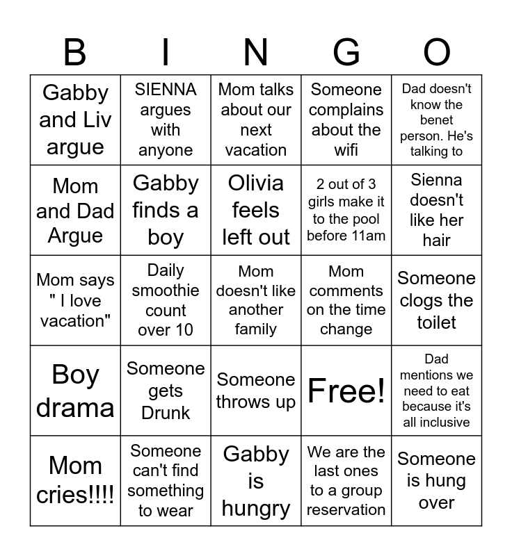 This bingo card has 25 words: Someone gets Drunk, Gabby is hungry, Olivia feels left out, Mom cries!!!!, Dad doesn't know the benet person. He's talking to, Gabby and Liv argue, Mom and Dad Argue, SIENNA argues with anyone, Mom comments on the time change, Someone throws up, 2 out of 3 girls make it to the pool before 11am, Mom says " I love vacation", Free!, Dad mentions we need to eat because it's all inclusive, Gabby finds a boy, Someone is hung over, Someone clogs the toilet, Mom talks about our next vacation, Sienna doesn't like her hair, Daily smoothie count over 10, Mom doesn't like another family, Someone can't find something to wear, Boy drama, Someone complains about the wifi and We are the last ones to a group reservation.