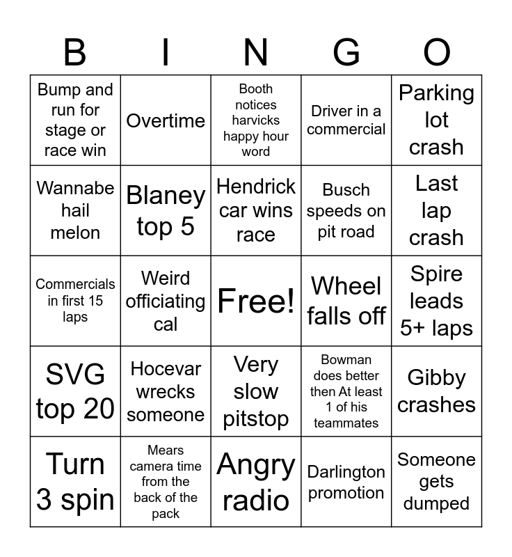 This bingo card has a free space and 24 words: Hocevar wrecks someone, Mears camera time from the back of the pack, Hendrick car wins race, Turn 3 spin, Parking lot crash, Bump and run for stage or race win, Wannabe hail melon, Overtime, Wheel falls off, Very slow pitstop, Busch speeds on pit road, Commercials in first 15 laps, Bowman does better then At least 1 of his teammates, Gibby crashes, Blaney top 5, Darlington promotion, Spire leads 5+ laps, Booth notices harvicks happy hour word, Last lap crash, Weird officiating cal, Someone gets dumped, SVG top 20, Driver in a commercial and Angry radio.