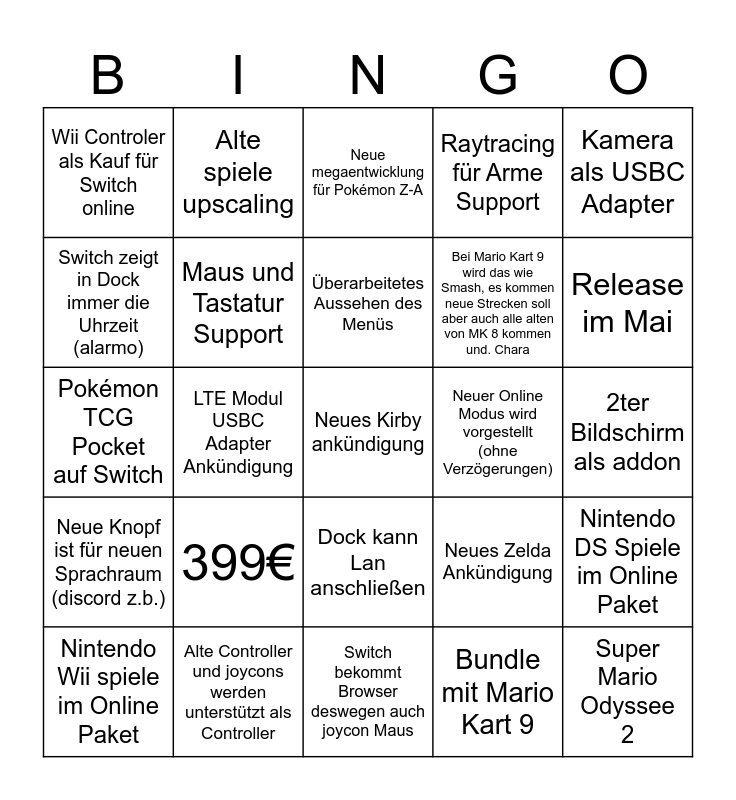 This bingo card has a free space and 24 words: 399€, Alte Controller und joycons werden unterstützt als Controller, Überarbeitetes Aussehen des Menüs, Nintendo Wii spiele im Online Paket, Kamera als USBC Adapter, Wii Controler als Kauf für Switch online, Switch zeigt in Dock immer die Uhrzeit (alarmo), Alte spiele upscaling, Neuer Online Modus wird vorgestellt (ohne Verzögerungen), Dock kann Lan anschließen, Bei Mario Kart 9 wird das wie Smash, es kommen neue Strecken soll aber auch alle alten von MK 8 kommen und. Chara, Pokémon TCG Pocket auf Switch, Neues Zelda Ankündigung, Nintendo DS Spiele im Online Paket, Maus und Tastatur Support, Bundle mit Mario Kart 9, 2ter Bildschirm als addon, Neue megaentwicklung für Pokémon Z-A, Release im Mai, LTE Modul USBC Adapter Ankündigung, Super Mario Odyssee 2, Neue Knopf ist für neuen Sprachraum (discord z.b.), Raytracing für Arme Support and Switch bekommt Browser deswegen auch joycon Maus.