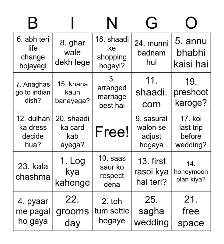 This bingo card has a free space and 25 words: 1. Log kya kahenge, 2. toh tum settle hogaye, 3. arranged marriage best hai, 4. pyaar me pagal ho gaya, 5. annu bhabhi kaisi hai, 6. abh teri life change hojayegi, 7. Anaghas go to indian dish?, 8. ghar wale dekh lege, 9. sasural walon se adjust hogaya, 10. saas saur ko respect dena, 11. shaadi. com, 12. dulhan ka dress decide hua?, 13. first rasoi kya hai teri?, 14. honeymoon plan kiya?, 15. khana kaun banayega?, 16. joote churane ke liye tayar, 17. koi last trip before wedding?, 18. shaadi ke shopping hogayi?, 19. preshoot karoge?, 20. shaadi ka card kab ayega?, 21. free space, 22. grooms day, 23. kala chashma, 24. munni badnam hui and 25. sagha wedding.