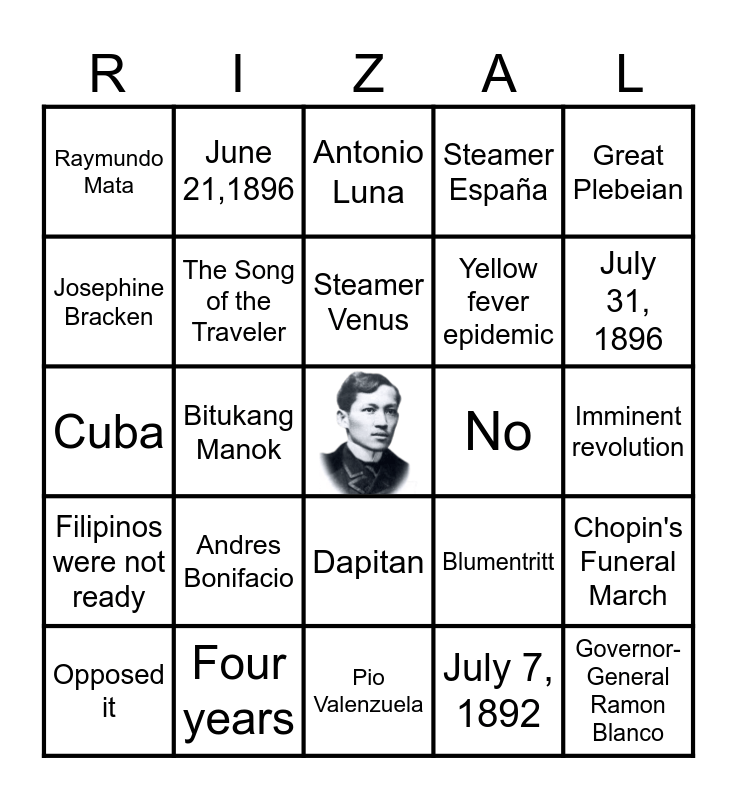 This bingo card has a free space and 24 words: Opposed it, Andres Bonifacio, Steamer Venus, July 7, 1892, Great Plebeian, Raymundo Mata, June 21,1896, Antonio Luna, No, Imminent revolution, Cuba, The Song of the Traveler, Blumentritt, Chopin's Funeral March, Josephine Bracken, Four years, Pio Valenzuela, Steamer España, July 31, 1896, Filipinos were not ready, Bitukang Manok, Dapitan, Yellow fever epidemic and Governor-General Ramon Blanco.