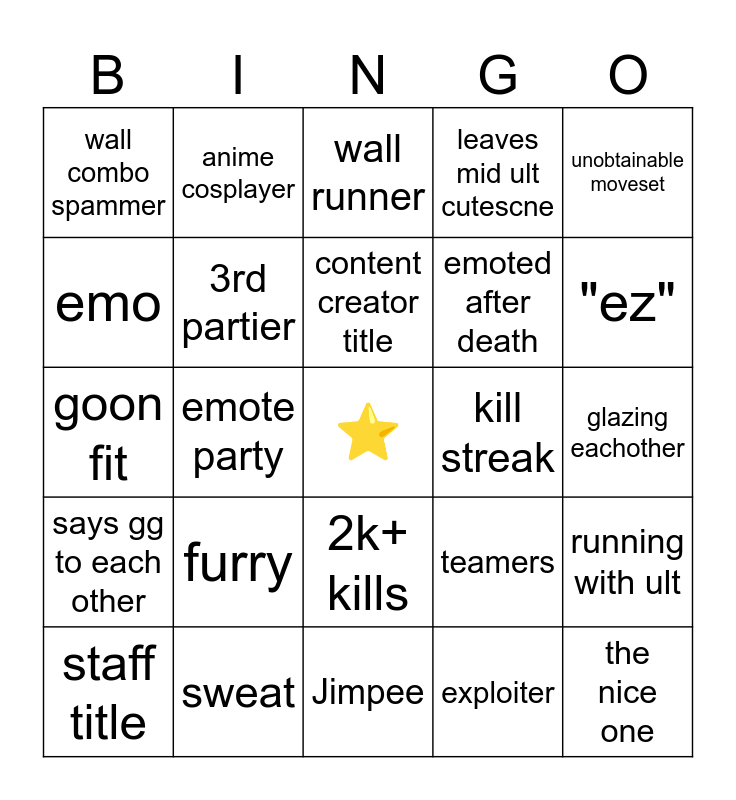 This bingo card has a free space and 24 words: furry, sweat, content creator title, staff title, unobtainable moveset, wall combo spammer, emo, anime cosplayer, kill streak, 2k+ kills, emoted after death, goon fit, teamers, running with ult, 3rd partier, exploiter, glazing eachother, wall runner, "ez", emote party, the nice one, says gg to each other, leaves mid ult cutescne and Jimpee.