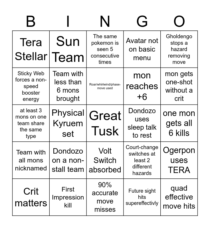 This bingo card has a free space and 65 words: Opponent forfeits, Kingambit looses a sucker punch 50/50, NFE Mon sighted, Ogerpon uses TERA, Booster energy on at least 2 mons on a team, Team without a single OU Mon, Sun Team, Zamazenta switches in without its ability activating, Roar/whirlwind/phase-move used, Switch or switch move from both sides in one turn, Volt Switch absorbed, Kingambit wins a sucker punch 50/50, one mon gets all 6 kills, Gholdengo stops a hazard removing move, Glimmora faints without setting any hazards, Sticky Web forces a non-speed booster energy, Physical Kyruem set, Tera Stellar, Hard prediction (super-effective vs switchin mon, resisted by switchout mon), mon reaches +6, Dondozo on a non-stall team, Team with all mons nicknamed, Avatar not on basic menu, Focus blast misses, Weather vs Weather, UU or below mon gets 3+ kills, Kingambit doesn't come in until its the last mon left, Paralyzed mon gets stopped immediately after getting the condition, quad effective move hits, Knock-off doesn't remove an item, Crit matters, Both players type in chat, Hazards kill something on switch-in, Samarott-Hisui gets 3 layers of spikes up, Court-change switches at least 2 different hazards, First Impression kill, Mon boosts up and gets killed on the same turn, at least 3 mons on one team share the same type, Future sight hits supereffectivly, Toxic spikes removed via a poison type switching in, Team with less than 6 mons brought, Mon named in a different language, Dondozo uses sleep talk to rest, Mon with a mega brought, encore a boosting move, move does less than 10% damage, mon gets one-shot without a crit, poison or deadly poison kills a mon, Draco Meteor used twice in a row, a move fails twice in a row, Sweep ends after multiple things already one shot, Team has a flavor themed team, Battle reaches 50 turns, 90% accurate move misses, Pokemon hit super effectively on the turn it teras, Pokemon's ability is changed/neutralized, Entire team weak to freeze dry, The same pokemon is seen 5 consecutive times, Non BE/Berry single use item procs, Manual weather or terrain used, Screens Destroyed, Collective shocked reaction at a play, Pokemon hits itself in confusion, Loss due to battle timer and Spelling error anywhere besides player name.