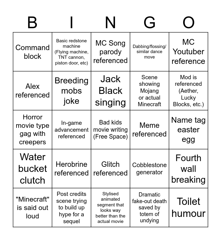 This bingo card has a free space and 24 words: Herobrine referenced, Post credits scene trying to build up hype for a sequel, Jack Black singing, "Minecraft" is said out loud, MC Youtuber reference, Command block, Alex referenced, Basic redstone machine (Flying machine, TNT cannon, piston door, etc), Meme referenced, Glitch referenced, Scene showing Mojang or actual Minecraft, Horror movie type gag with creepers, Cobblestone generator, Fourth wall breaking, Breeding mobs joke, Dramatic fake-out death saved by totem of undying, Name tag easter egg, MC Song parody referenced, Mod is referenced (Aether, Lucky Blocks, etc.), In-game advancement referenced, Toilet humour, Water bucket clutch, Dabbing/flossing/ similar dance move and Stylised animated segment that looks way better than the actual movie.
