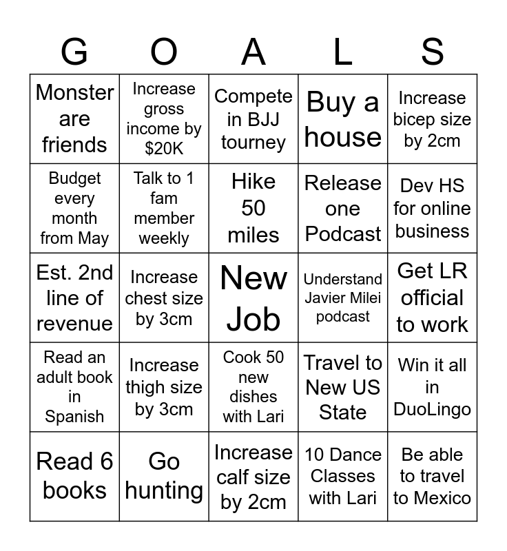 This bingo card has a free space and 24 words: Increase thigh size by 3cm, Go hunting, Hike 50 miles, Read 6 books, Increase bicep size by 2cm, Monster are friends, Budget every month from May, Increase gross income by $20K, Understand Javier Milei podcast, Cook 50 new dishes with Lari, Release one Podcast, Est. 2nd line of revenue, Travel to New US State, Win it all in DuoLingo, Talk to 1 fam member weekly, 10 Dance Classes with Lari, Get LR official to work, Compete in BJJ tourney, Dev HS for online business, Increase chest size by 3cm, Be able to travel to Mexico, Read an adult book in Spanish, Buy a house and Increase calf size by 2cm.