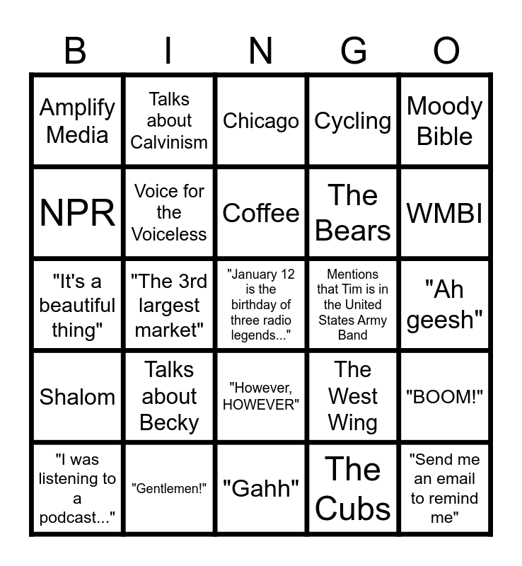 This bingo card has 25 words: Talks about Becky, "Gahh", Coffee, "I was listening to a podcast...", Moody Bible, Amplify Media, NPR, Talks about Calvinism, Mentions that Tim is in the United States Army Band, "However, HOWEVER", The Bears, "It's a beautiful thing", The West Wing, "BOOM!", Voice for the Voiceless, "Send me an email to remind me", "Ah geesh", Chicago, WMBI, "The 3rd largest market", "January 12 is the birthday of three radio legends...", "Gentlemen!", Shalom, Cycling and The Cubs.
