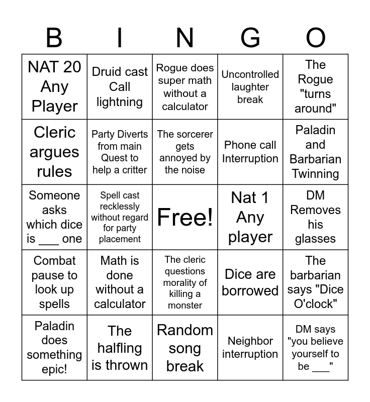 This bingo card has a free space and 24 words: Math is done without a calculator, The halfling is thrown, The sorcerer gets annoyed by the noise, Paladin does something epic!, The Rogue "turns around", NAT 20 Any Player, Cleric argues rules, Druid cast Call lightning, Nat 1 Any player, The cleric questions morality of killing a monster, Phone call Interruption, Someone asks which dice is ___ one, Dice are borrowed, The barbarian says "Dice O'clock", Party Diverts from main Quest to help a critter, Neighbor interruption, DM Removes his glasses, Rogue does super math without a calculator, Paladin and Barbarian Twinning, Spell cast recklessly without regard for party placement, DM says "you believe yourself to be ___", Combat pause to look up spells, Uncontrolled laughter break and Random song break.