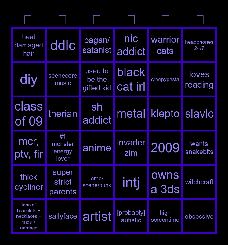 This bingo card has 36 words: intj, emo/ scene/punk, [probably] autistic, diy, mcr, ptv, fir, metal, scenecore music, artist, warrior cats, owns a 3ds, loves reading, nic addict, witchcraft, therian, black cat irl, heat damaged hair, thick eyeliner, klepto, class of 09, pagan/ satanist, sh addict, #1 monster energy lover, invader zim, anime, 2009, ddlc, creepypasta, sallyface, used to be the gifted kid, headphones 24/7, obsessive, tons of bracelets + necklaces + rings + earrings, wants snakebits, slavic, super strict parents and high screentime.
