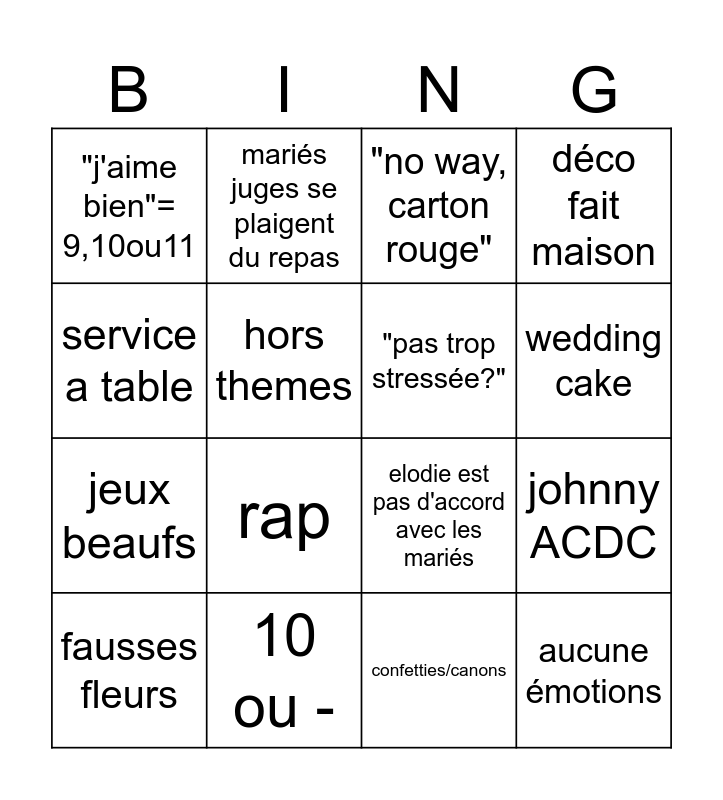 This bingo card has 16 words: 10 ou -, johnny ACDC, "no way, carton rouge", "j'aime bien"= 9,10ou11, jeux beaufs, mariés juges se plaigent du repas, elodie est pas d'accord avec les mariés, confetties/canons, service a table, hors themes, fausses fleurs, déco fait maison, rap, wedding cake, "pas trop stressée?" and aucune émotions.
