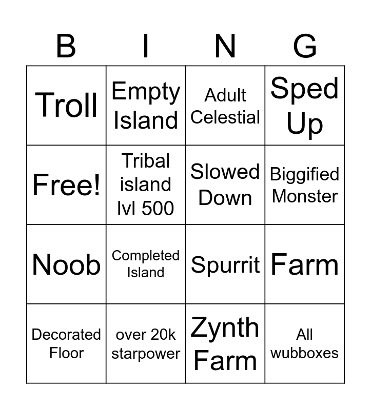This bingo card has 16 words: over 20k starpower, Farm, Adult Celestial, Troll, Noob, Empty Island, Spurrit, Zynth Farm, Free!, Tribal island lvl 500, Decorated Floor, Sped Up, Completed Island, Biggified Monster, Slowed Down and All wubboxes.