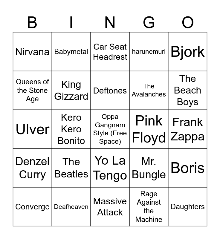 This bingo card has a free space and 24 words: The Beatles, Deafheaven, Deftones, Converge, Bjork, Nirvana, Queens of the Stone Age, Babymetal, Pink Floyd, Yo La Tengo, The Avalanches, Ulver, Mr. Bungle, Boris, King Gizzard, Rage Against the Machine, Frank Zappa, Car Seat Headrest, The Beach Boys, Kero Kero Bonito, Daughters, Denzel Curry, harunemuri and Massive Attack.