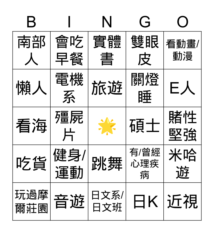This bingo card has a free space and 24 words: 健身/運動, 音遊, 旅遊, 玩過摩爾莊園, 看動畫/動漫, 南部人, 懶人, 會吃早餐, 碩士, 跳舞, 關燈睡, 看海, 有/曾經心理疾病, 米哈遊, 電機系, 日K, 賭性堅強, 實體書, E人, 殭屍片, 近視, 吃貨, 雙眼皮 and 日文系/日文班.