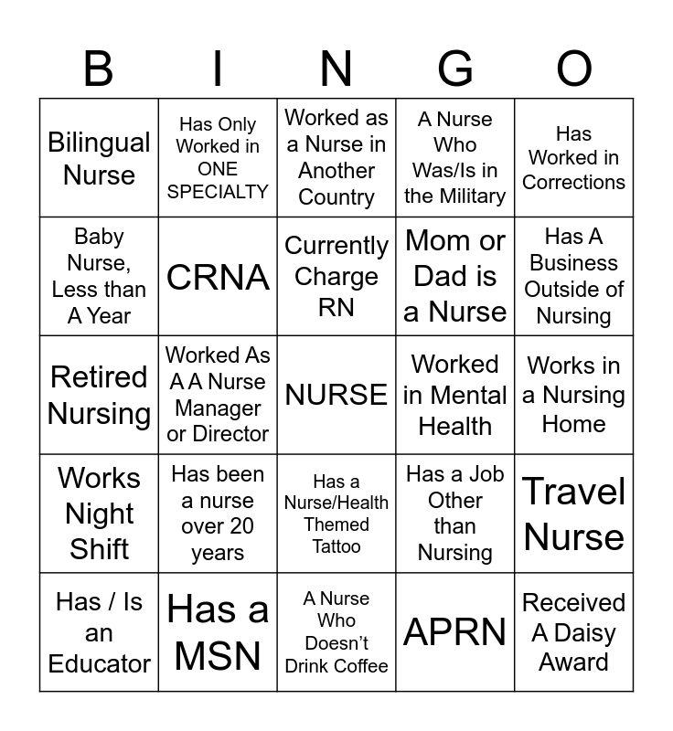 This bingo card has a free space and 24 words: Has been a nurse over 20 years, Has a MSN, Currently Charge RN, Has / Is an Educator, Has Worked in Corrections, Bilingual Nurse, Baby Nurse, Less than A Year, Has Only Worked in ONE SPECIALTY, Worked in Mental Health, Has a Nurse/Health Themed Tattoo, Mom or Dad is a Nurse, Retired Nursing, Has a Job Other than Nursing, Travel Nurse, CRNA, APRN, Works in a Nursing Home, Worked as a Nurse in Another Country, Has A Business Outside of Nursing, Worked As A A Nurse Manager or Director, Received A Daisy Award, Works Night Shift, A Nurse Who Was/Is in the Military and A Nurse Who Doesn’t Drink Coffee.