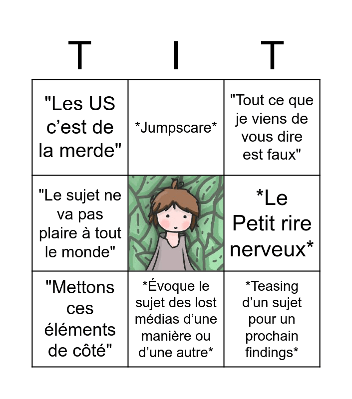 This bingo card has a free space and 8 words: *Le Petit rire nerveux*, "Tout ce que je viens de vous dire est faux", *Jumpscare*, "Mettons ces éléments de côté", "Les US c’est de la merde", *Teasing d’un sujet pour un prochain findings*, "Le sujet ne va pas plaire à tout le monde" and *Évoque le sujet des lost médias d’une manière ou d’une autre*.