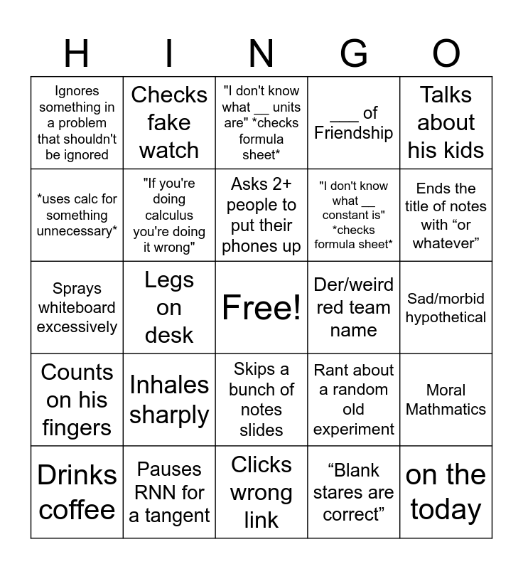 This bingo card has a free space and 44 words: "I'm not going to explain it" *explains it*, on the today, Yes or No to a non yes or no question, Drinks coffee, Worries about running out of whiteboard space, “Blank stares are correct”, "I don't know what __ units are" *checks formula sheet*, Phone Calculator, Talks about his kids, Pauses RNN for a tangent, ___ of Friendship, Der/weird red team name, Skips a bunch of notes slides, Inhales sharply, Calls cyan blue and green, Clicks wrong link, Small Whiteboard, Sprays whiteboard excessively, Ends the title of notes with "And Stuff", Ends the title of notes with “or whatever”, Checks fake watch, Rolled sleeves, Black button-up shirt, Ignores something in a problem that shouldn't be ignored, Mentions fake student, Sad/morbid hypothetical, Does something the"harder way", Rant about a random dead guy, Rant about a random old experiment, Counts on his fingers, Uses markers to demonstrate a physics concept, Moral Mathmatics, "Patrick won't like this", "Holy smokes", Legs on desk, Brings kids to class, Singles out Calc BC/Digital students, Stares worryingly at Grooms when Calc is mentioned, Asks 2+ people to put their phones up, *uses calc for something unnecessary*, "I don't know what __ constant is" *checks formula sheet*, Talks about an old student, "If you're doing calculus you're doing it wrong" and "Trust me".