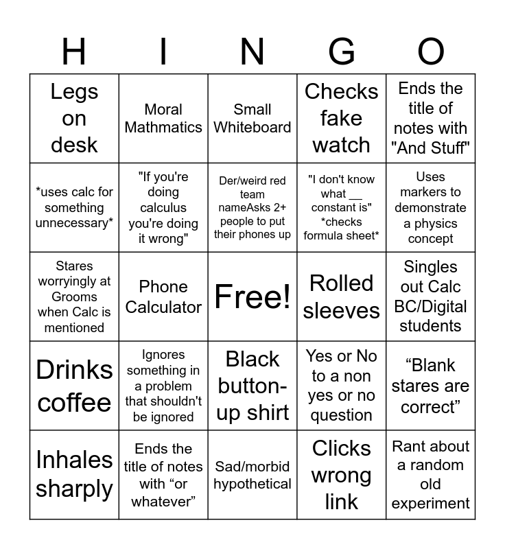 This bingo card has a free space and 43 words: Rant about a random dead guy, Rant about a random old experiment, Skips a bunch of notes slides, Inhales sharply, Calls cyan blue and green, Clicks wrong link, Small Whiteboard, Sprays whiteboard excessively, Ends the title of notes with "And Stuff", Ends the title of notes with “or whatever”, Checks fake watch, Rolled sleeves, Black button-up shirt, Ignores something in a problem that shouldn't be ignored, Mentions fake student, Sad/morbid hypothetical, Does something the"harder way", Stares worryingly at Grooms when Calc is mentioned, Counts on his fingers, Uses markers to demonstrate a physics concept, Moral Mathmatics, "Patrick won't like this", "Holy smokes", Legs on desk, Brings kids to class, Singles out Calc BC/Digital students, "I'm not going to explain it" *explains it*, on the today, Yes or No to a non yes or no question, Drinks coffee, Worries about running out of whiteboard space, “Blank stares are correct”, "I don't know what __ units are" *checks formula sheet*, Phone Calculator, Talks about his kids, Pauses RNN for a tangent, ___ of Friendship, Der/weird red team nameAsks 2+ people to put their phones up, *uses calc for something unnecessary*, "I don't know what __ constant is" *checks formula sheet*, Talks about an old student, "If you're doing calculus you're doing it wrong" and "Trust me".