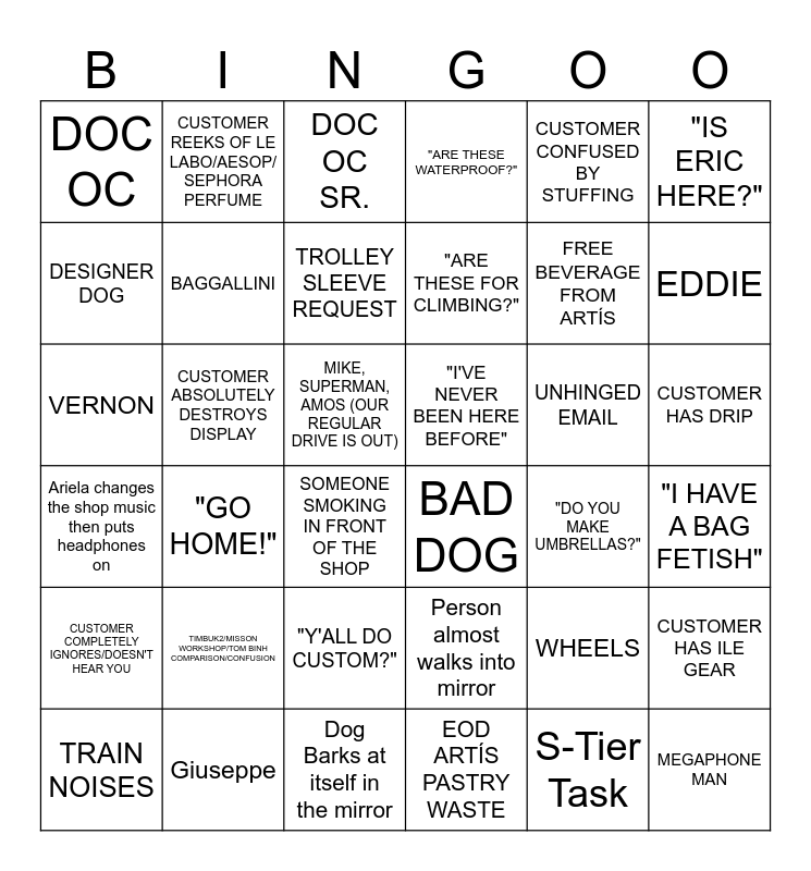 This bingo card has 41 words: EOD ARTÍS PASTRY WASTE, FREE BEVERAGE FROM ARTÍS, "YOU MAKE IT ALL HERE?", DESIGNER DOG, BAD DOG, CUSTOMER HAS DRIP, BAGGALLINI, CUSTOMER PUTS PRODUCT BACK INCORRECTLY, CUSTOMER CONFUSED BY STUFFING, "I'VE NEVER BEEN HERE BEFORE", EDDIE, "ARE THESE WATERPROOF?", VERNON, MIKE, SUPERMAN, AMOS (OUR REGULAR DRIVE IS OUT), CUSTOMER ABSOLUTELY DESTROYS DISPLAY, UNHINGED EMAIL, TRAIN NOISES, DOC OC, S-Tier Task, DOC OC SR., "GO HOME!", CUSTOMER COMPLETELY IGNORES/DOESN'T HEAR YOU, "DO YOU MAKE UMBRELLAS?", TROLLEY SLEEVE REQUEST, MEGAPHONE MAN, WHEELS, "I HAVE A BAG FETISH", CUSTOMER CHECKS THEMSELVES OUT IN MIRROR/TAKES SELFIE, "ARE THESE FOR CLIMBING?", TIMBUK2/MISSON WORKSHOP/TOM BINH COMPARISON/CONFUSION, "ARE THESE RECYCLED?", CUSTOMER REEKS OF LE LABO/AESOP/ SEPHORA PERFUME, SOMEONE SMOKING IN FRONT OF THE SHOP, Giuseppe, Ariela changes the shop music then puts headphones on, "IS ERIC HERE?", "Y'ALL DO CUSTOM?", CUSTOMER HAS ILE GEAR, Dog Barks at itself in the mirror, Person almost walks into mirror and GOOD DOG.