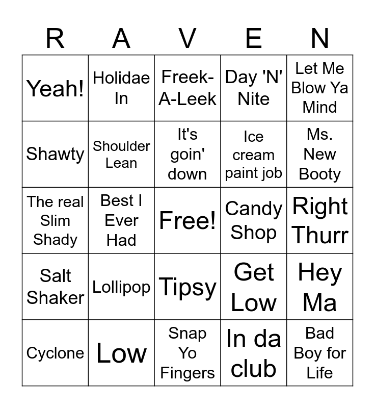 This bingo card has a free space and 42 words: Get Ur Freak On, It's goin' down, Ms. Jackson, Lollipop, In da club, Hey Ma, Bad Boy for Life, Hot in herre, Freek-A-Leek, Tipsy, Right Thurr, Ms. New Booty, Best I Ever Had, Let Me Blow Ya Mind, What's your fantasy, Get Low, Drop it like it's hot, The real Slim Shady, Wipe Me Down, Holidae In, Shawty, This is why I'm hot, Slow Motion, Yeah!, Rock Yo Hips, Soul Survivor, Ice cream paint job, Shorty wanna ride, Grillz, Shake ya tailfeather, Ridin', Salt Shaker, Shoulder Lean, Snap Yo Fingers, Buy U a Drank, Cyclone, Low, Candy Shop, Hate it or love it, Lean wit it, rock wit it, Day 'N' Nite and Pursuit of Happiness.
