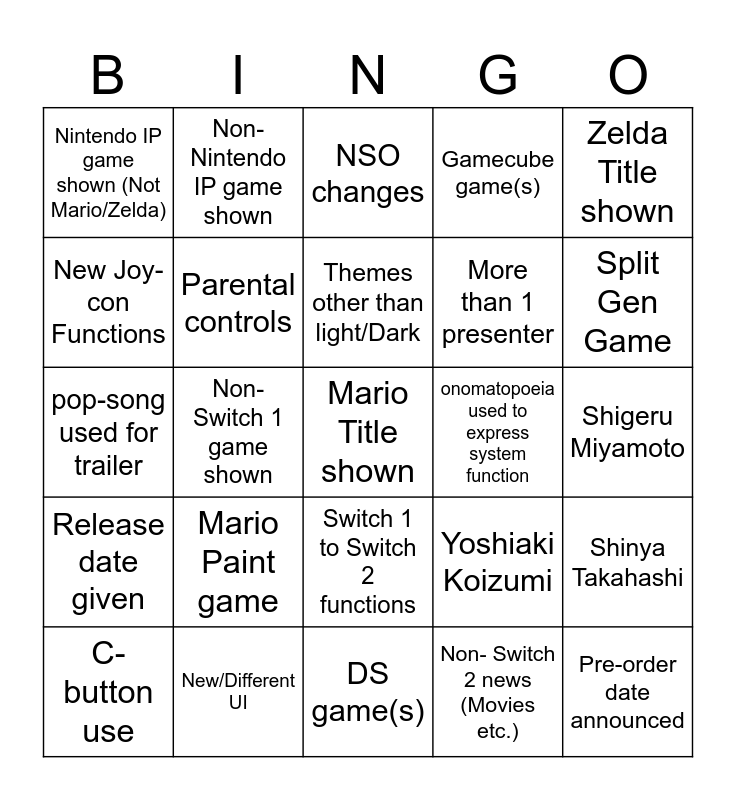 This bingo card has a free space and 24 words: Mario Paint game, New/Different UI, Themes other than light/Dark, C-button use, Zelda Title shown, Nintendo IP game shown (Not Mario/Zelda), New Joy-con Functions, Non-Nintendo IP game shown, onomatopoeia used to express system function, Switch 1 to Switch 2 functions, More than 1 presenter, pop-song used for trailer, Yoshiaki Koizumi, Shinya Takahashi, Parental controls, Non- Switch 2 news (Movies etc.), Shigeru Miyamoto, NSO changes, Split Gen Game, Non-Switch 1 game shown, Pre-order date announced, Release date given, Gamecube game(s) and DS game(s).