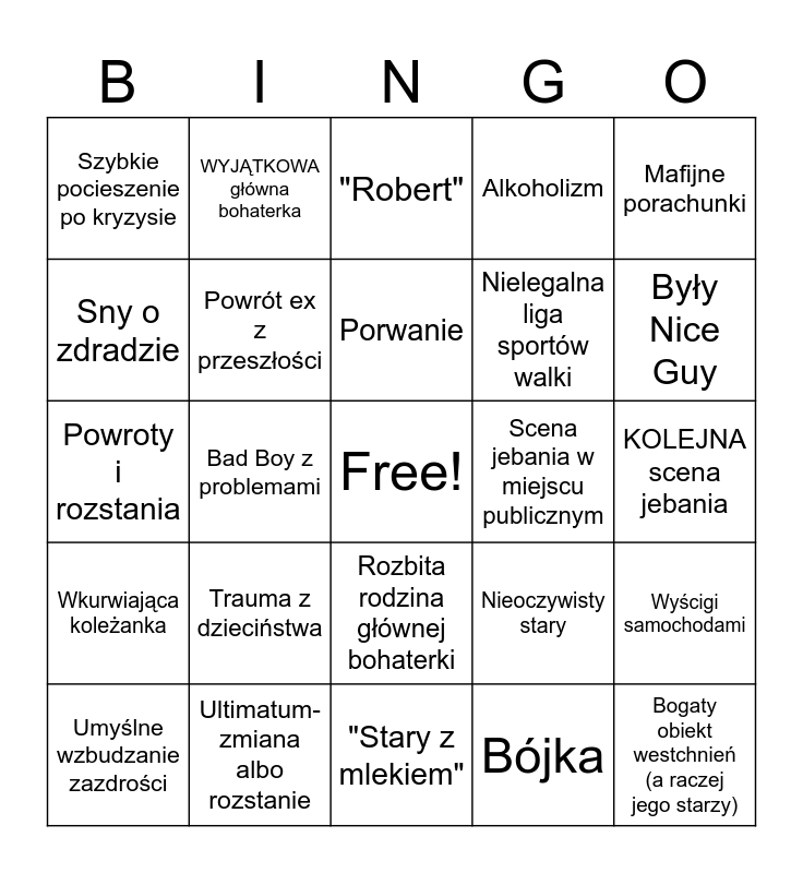 This bingo card has a free space and 24 words: Trauma z dzieciństwa, Ultimatum- zmiana albo rozstanie, Porwanie, Umyślne wzbudzanie zazdrości, Mafijne porachunki, Szybkie pocieszenie po kryzysie, Sny o zdradzie, WYJĄTKOWA główna bohaterka, Scena jebania w miejscu publicznym, Rozbita rodzina głównej bohaterki, Nielegalna liga sportów walki, Powroty i rozstania, Nieoczywisty stary, Wyścigi samochodami, Powrót ex z przeszłości, Bójka, KOLEJNA scena jebania, "Robert", Były Nice Guy, Bad Boy z problemami, Bogaty obiekt westchnień (a raczej jego starzy), Wkurwiająca koleżanka, Alkoholizm and "Stary z mlekiem".
