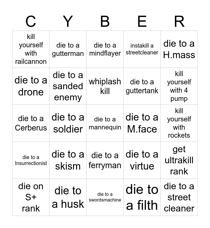 This bingo card has 30 words: die to a husk, charge back, die to a soldier, kill a enemy with M.face, kill yourself with railcannon, die to a mindflayer, die to a sanded enemy, die to a ferryman, die to a M.face, die to a swordsmachine, kill yourself with rockets, die to a mannequin, die to a filth, die to a street cleaner, kill yourself with 4 pump, die from falling, die to a virtue, die to a Insurrectionist, die to a skism, die to a H.mass, die to a Cerberus, die to a sentry, die to a gutterman, die to a guttertank, die to a drone, instakill a streetcleaner, get ultrakill rank, die on S+ rank, whiplash kill and die to an enraged enemy.