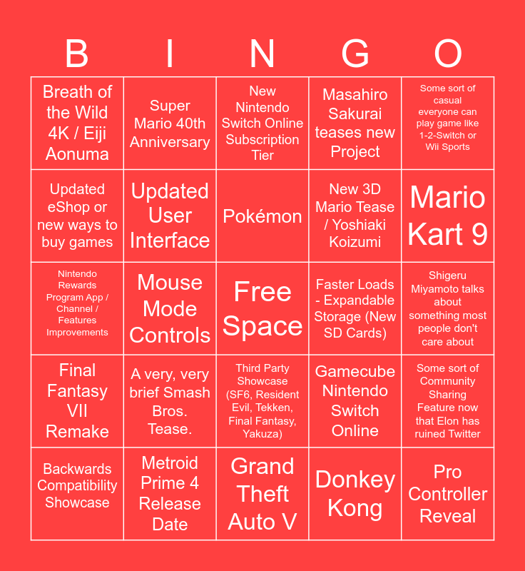 This bingo card has a free space and 24 words: Backwards Compatibility Showcase, A very, very brief Smash Bros. Tease., Pokémon, Donkey Kong, Some sort of casual everyone can play game like 1-2-Switch or Wii Sports, Breath of the Wild 4K / Eiji Aonuma, Super Mario 40th Anniversary, New Nintendo Switch Online Subscription Tier, Faster Loads - Expandable Storage (New SD Cards), Shigeru Miyamoto talks about something most people don't care about, Nintendo Rewards Program App / Channel / Features Improvements, Updated User Interface, Gamecube Nintendo Switch Online, Some sort of Community Sharing Feature now that Elon has ruined Twitter, Updated eShop or new ways to buy games, Metroid Prime 4 Release Date, Grand Theft Auto V, Masahiro Sakurai teases new Project, Mario Kart 9, Final Fantasy VII Remake, Mouse Mode Controls, Third Party Showcase (SF6, Resident Evil, Tekken, Final Fantasy, Yakuza), New 3D Mario Tease / Yoshiaki Koizumi and Pro Controller Reveal.